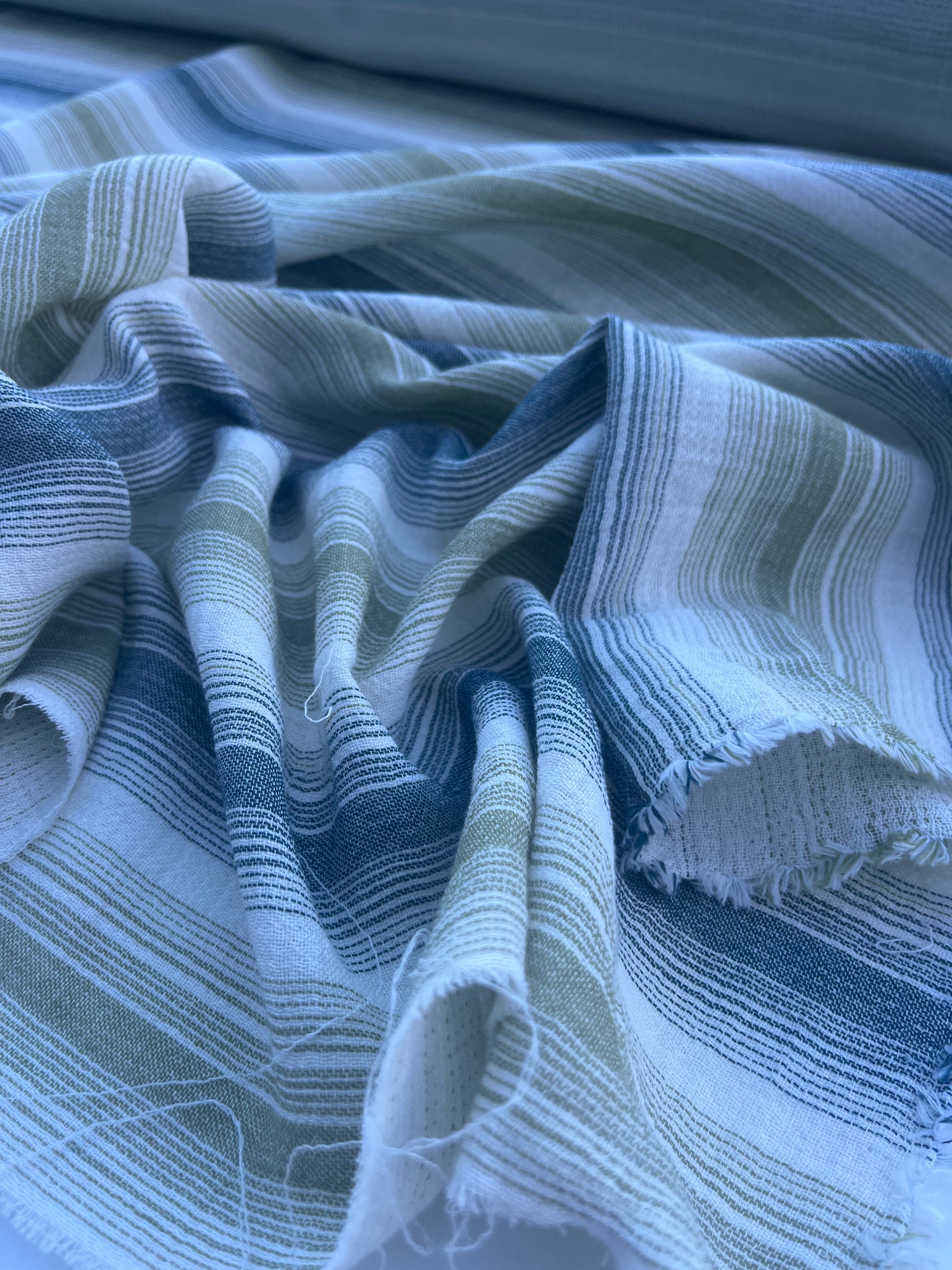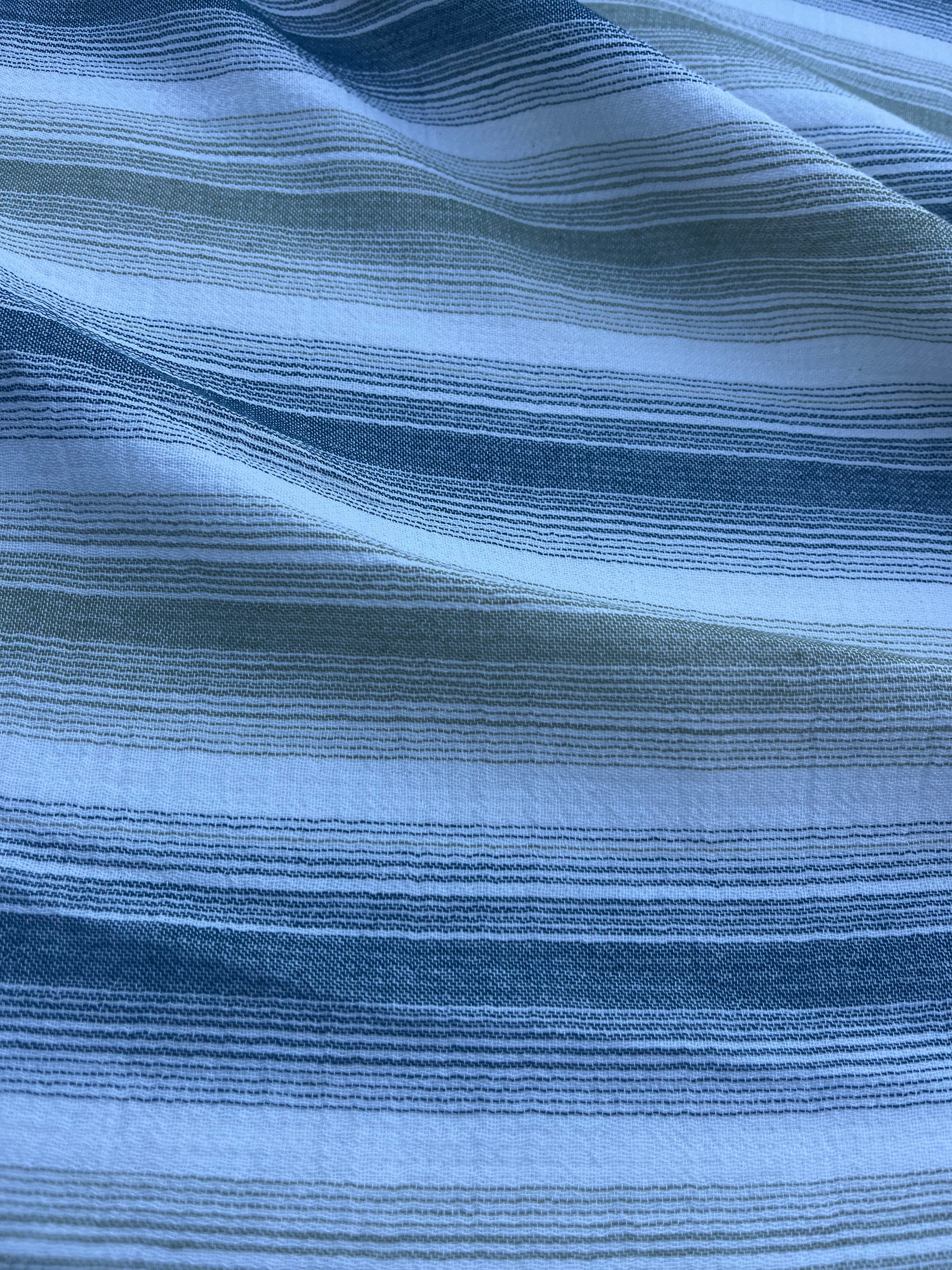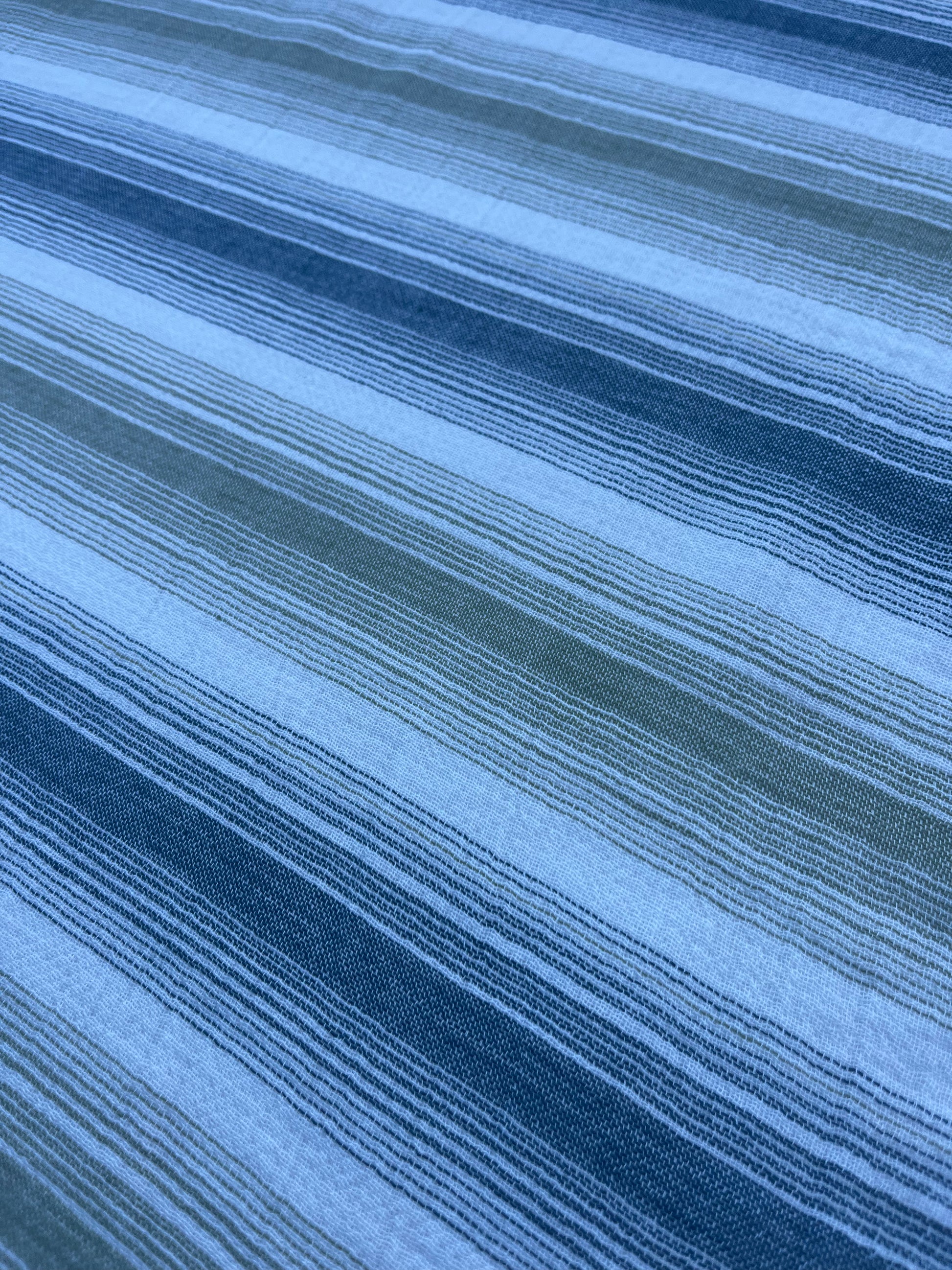 This high quality colour woven fabric, has a loose weaving and is very delicate semi- transparent,with horizontal stripes.