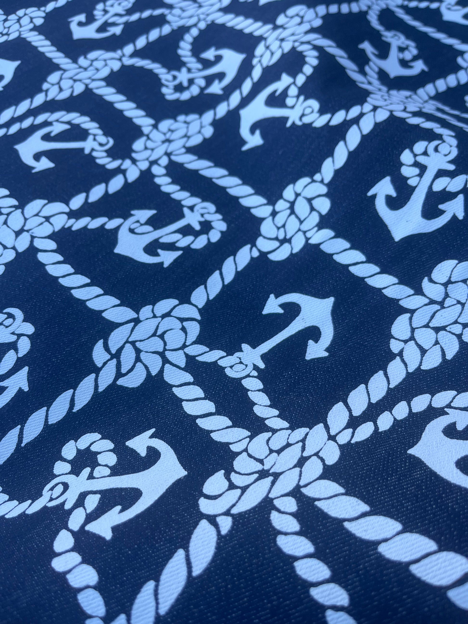Heavy indigo denim with slub effect and white print