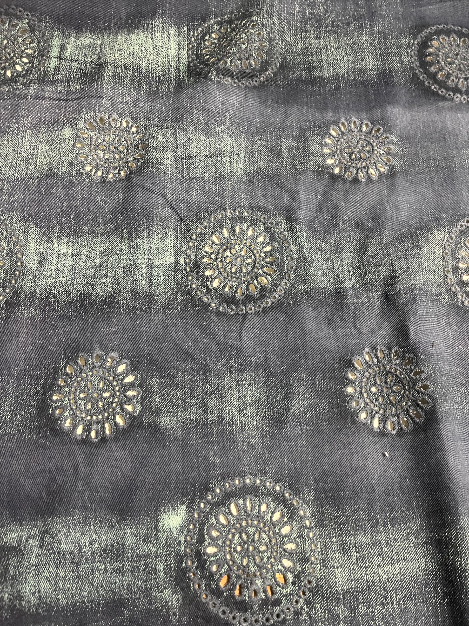 The denim fabric is embroidered and has a washed out effect. It will make very cool pants, dresses, and jackets.