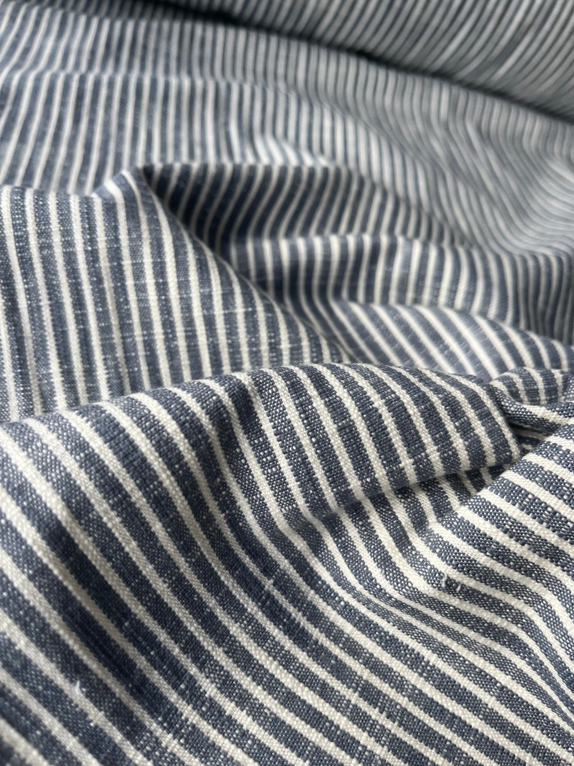 This colourwoven fabrics has stripes of +/- 5MM-2MM in the length. It is a heavy cotton linen, with a sporty touch.